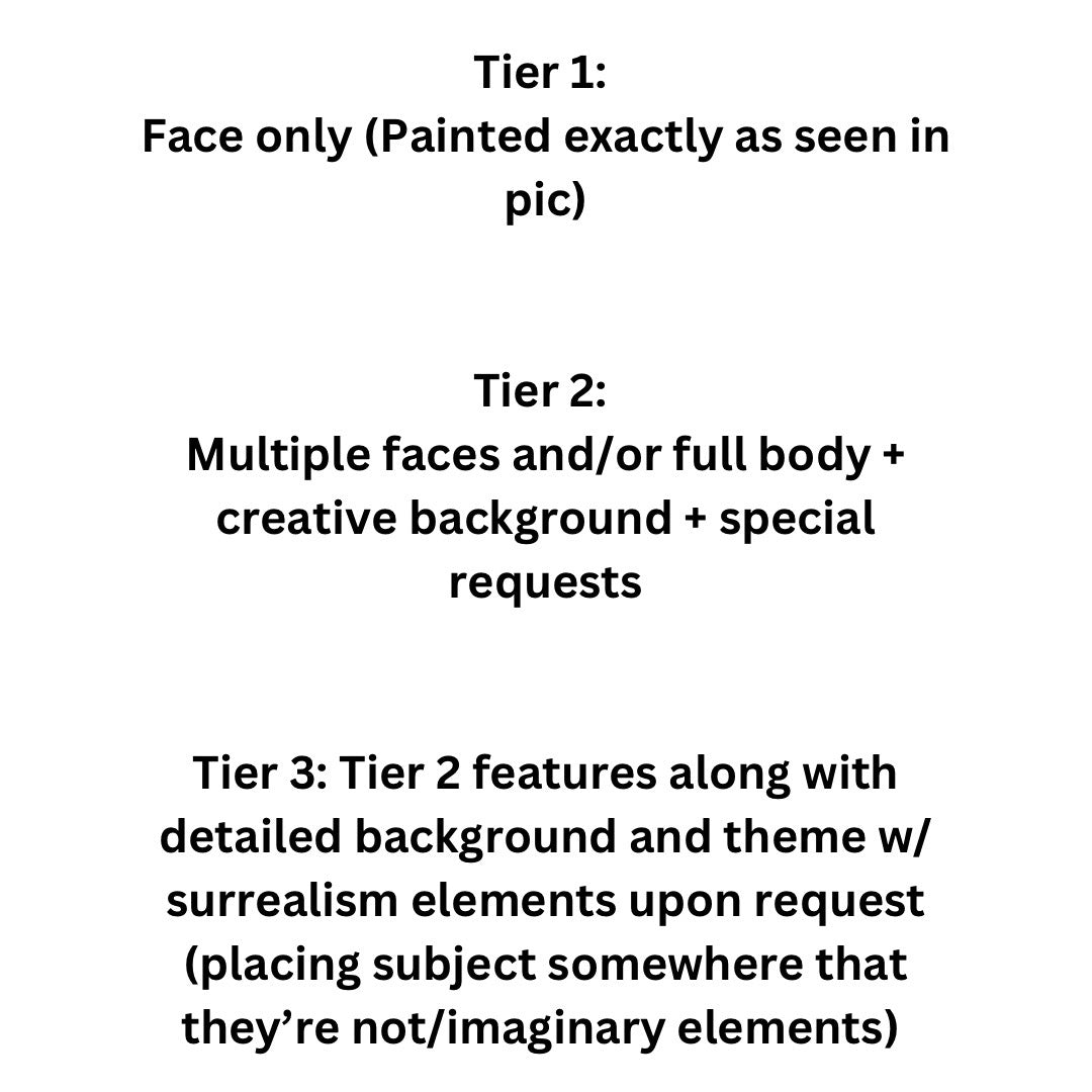 Tier 2 features along with detailed background and theme w/ surrealism elements upon request (placing subject somewhere they’re not/imaginary elements)